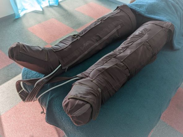 足首から太ももにかけて下から上へと絞り上げるようにエアーによる圧力をかけていきます。3段階調整に含めマジックテープにて留めている為、個所により細かい圧の調整ができるので、ご自身の程よい圧で受けていただけます!